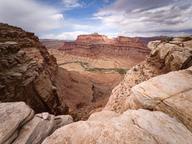 This hike climbs Arch Tower Canyon to the top of the San Rafael Reef. You'll enjoy a fun sense of adventure exploring your way up a wild canyon, sandstone cliffs, multicolored geology, interesting narrows, a tall butte with an arch and big views over Mexican Mountain from the top. You'll encounter a series of pouroffs and overgrown boulder pits that can be bypassed, usually on the left side as you head uphill. One pouroff requires scrambling with exposure, making this suitable for experienced hikers only.